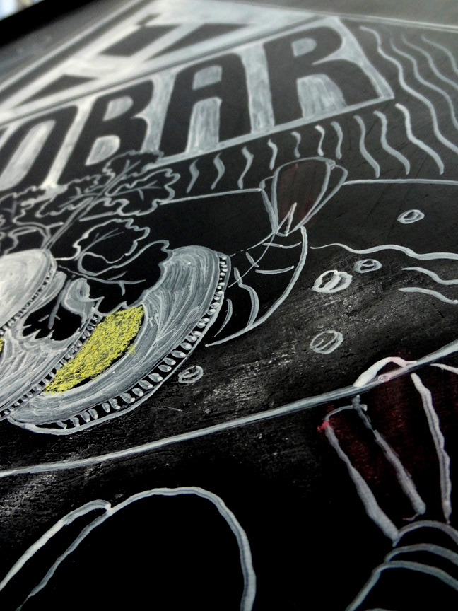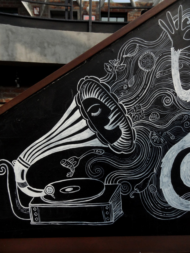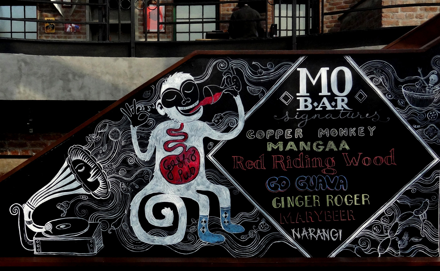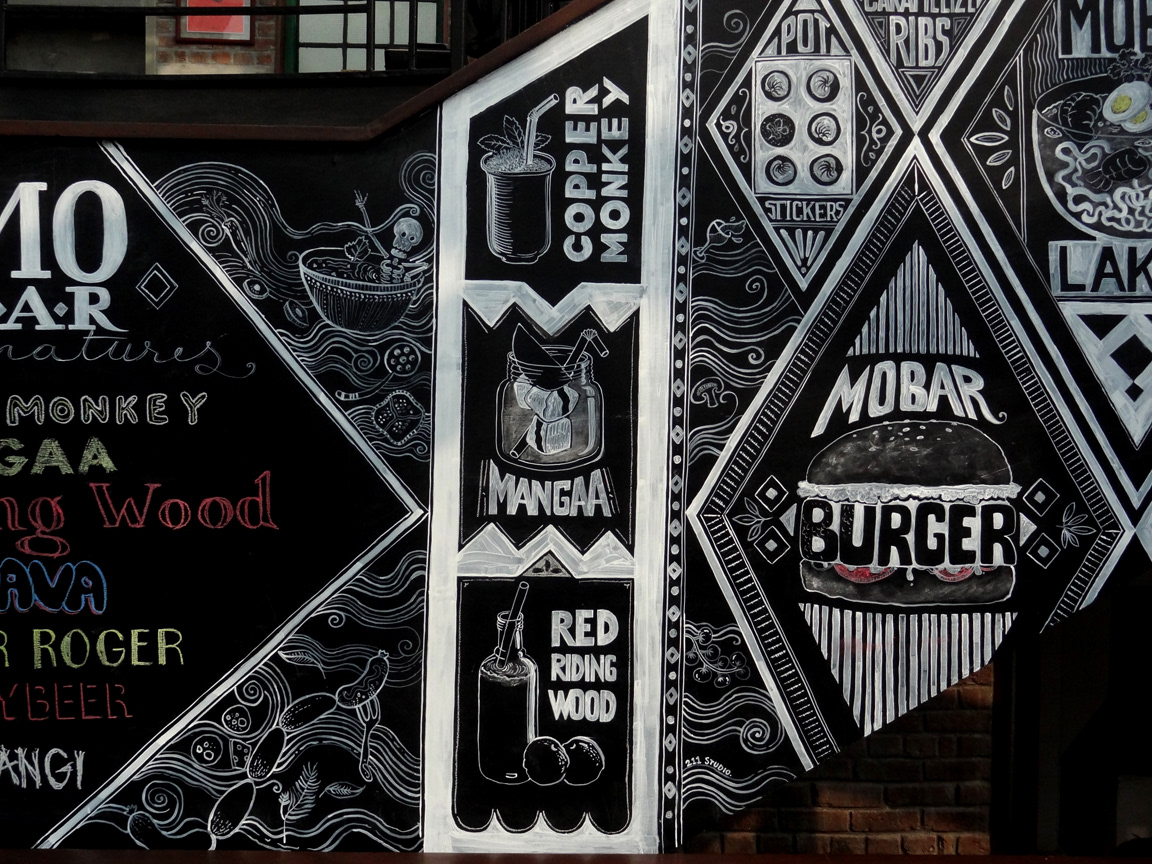 Illustrations done for Monkey Bar, a restaurant in New Delhi. Artwork done on a blackboard using acrylic paints and chalk.