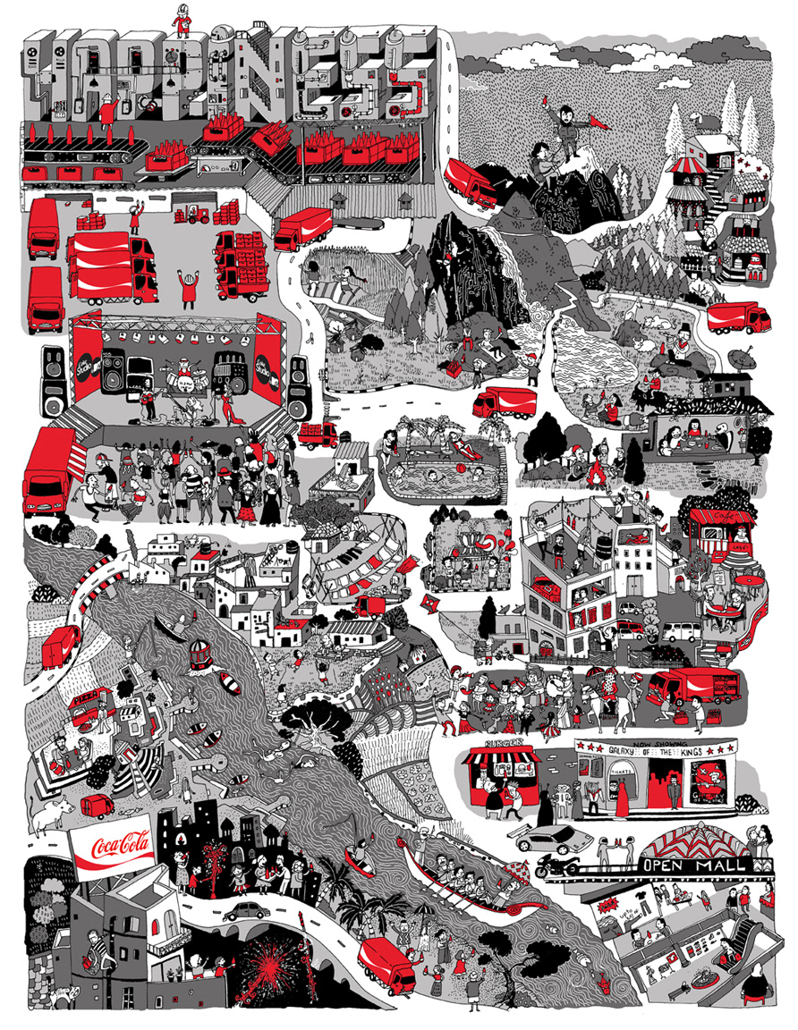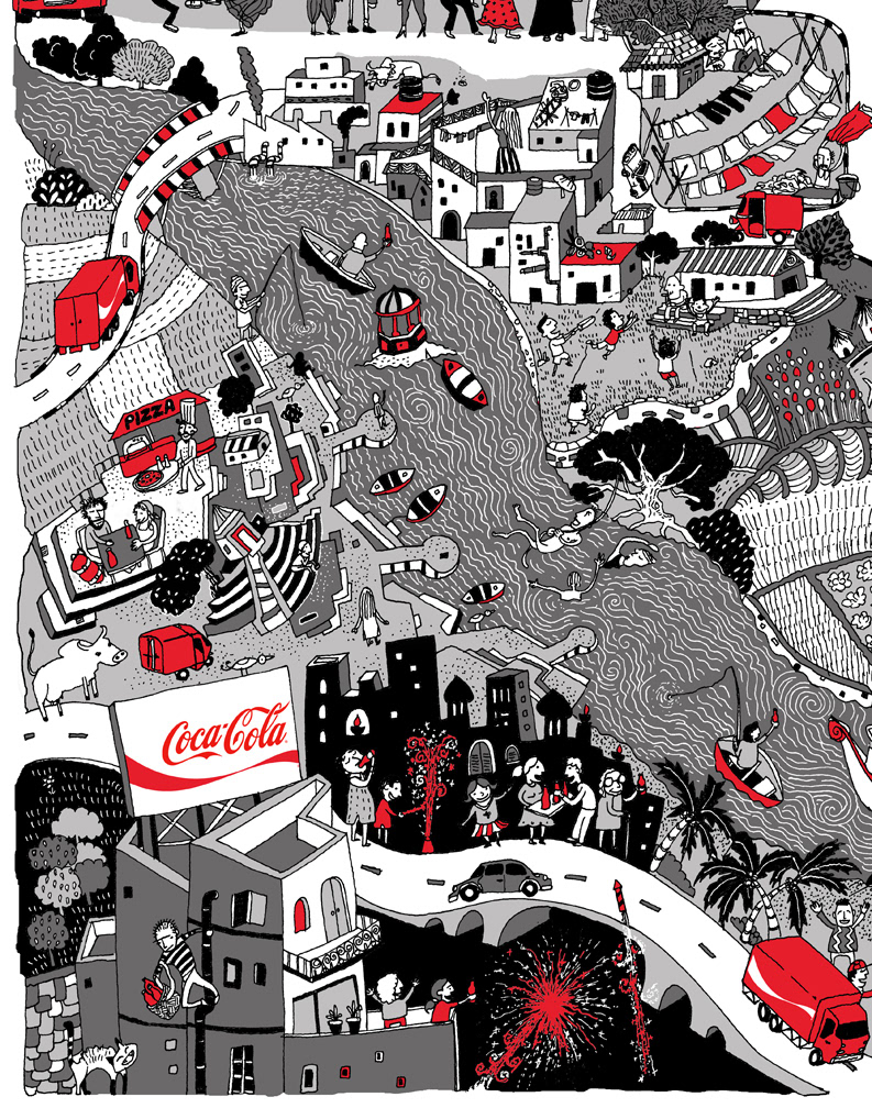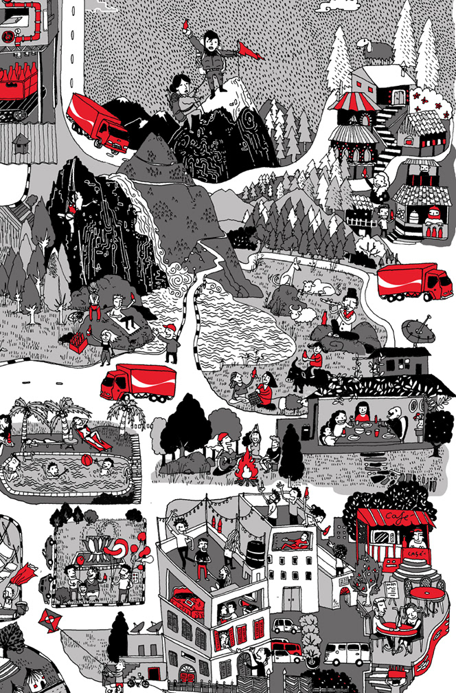 Illustration made for coca cola (india) for their bottlers convention. rotoring pen + vector fills