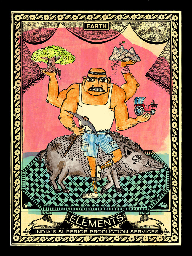 Promotional postcards for 'Elements Production Services' Inspired by Indian mythological figures and bengal woodcuts.